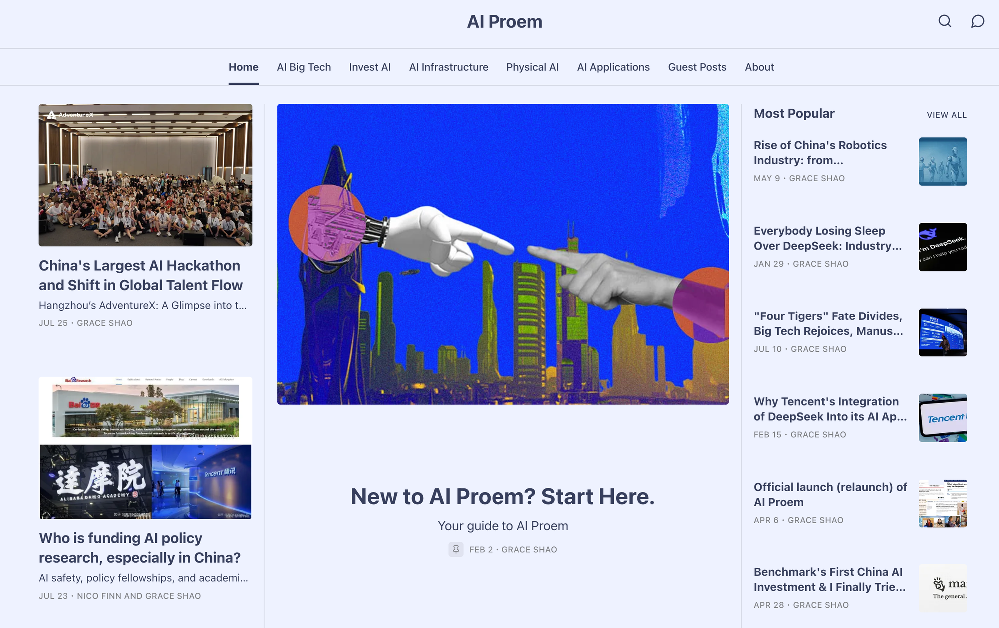 Grace Shao: I've been on different sides and worked in these tech companies for so long. I felt there was so much being overlooked. Since 2018 when the trade war broke out, many stories were hijacked by high-level geopolitical narratives. For someone passionate about telling stories of businesses and innovation, someone who personally straddles two worlds of the West and East, China and the US, I felt there was more I could do to bridge that knowledge gap. That's why I started AI Proem, writing about what interested me and people around me - mostly academics and investors. It took off on its own.